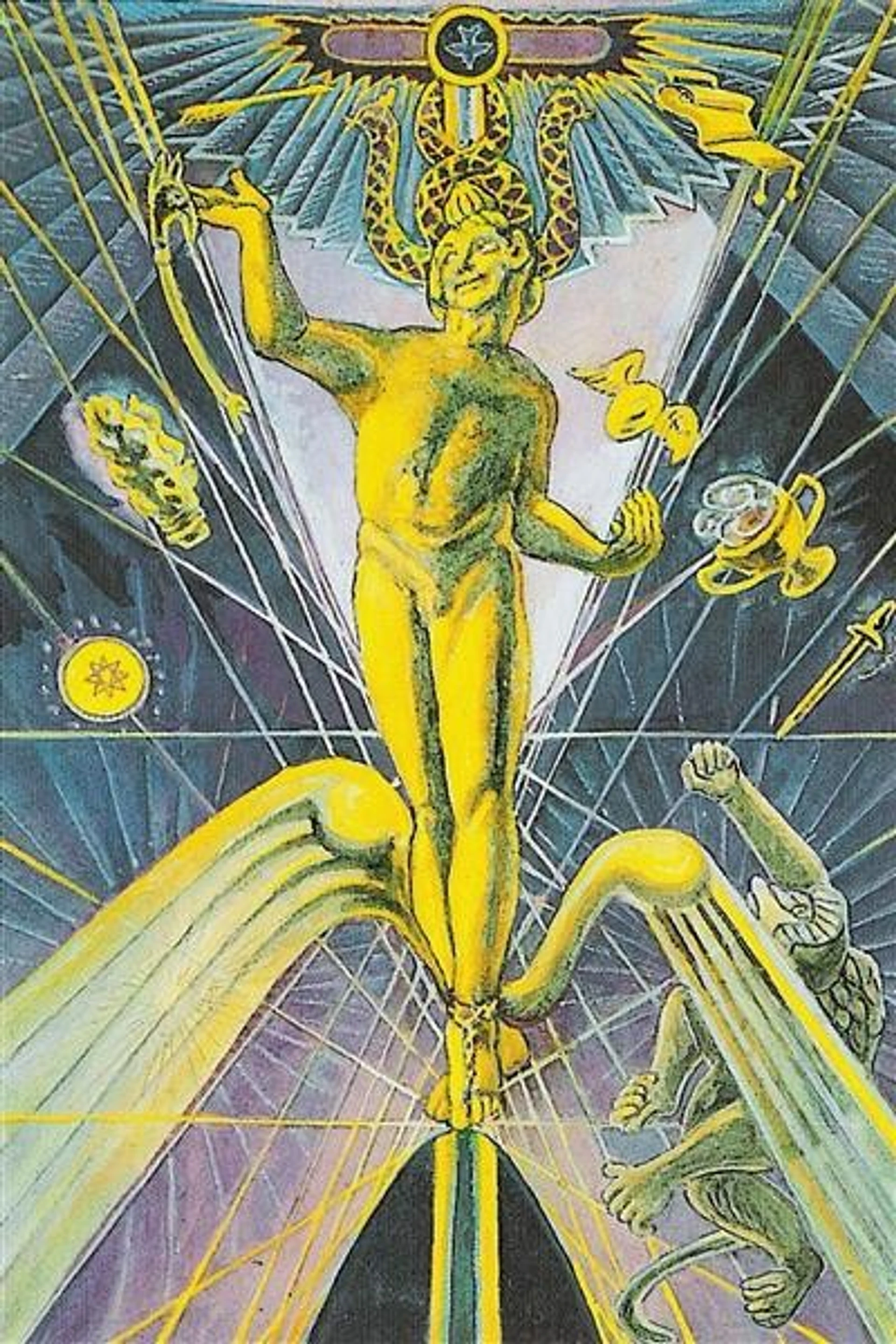 Büyücü'nün başarılı olması için, odaklanmış ve mevcut kalması, vücudunun fikirler için bir iletken olmasına izin vermesi gerekir. Kolları çapraz bir şekilde uzanmış, vücudu ilahi ilham ile fiziksel dünya veya toprak arasındaki bağlantıyı yansıtır. Kendisi yaratıcı süreci somutlaştırır. O olmadan, bu ikisini birbirine bağlayan hiçbir şey olmazdı ve “hiçlikten bir şey yaratmanın” hiçbir yolu olmazdı.